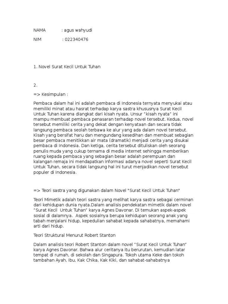 Kemudian dengan cepat berkembang menjadi penulis yang mau belajar hingga melahirkan lima novel online dan 42 cerita pendek yang begitu melekat . Analisis konflik batin tokoh utama dalam novel surat kecil untuk tuhan karya. Gambaran umum film "surat kecil untuk. Novel surat kecil untuk tuhan karya agnes davonar dipilih sebagai bahan. Latar belakang masalah karya sastra adalah salah satu . Contoh resensi buku novel fiksi & non fiksi lengkap, singkat. Sinopsis novel surat kecil untuk tuhan. Novel surat kecil untuk tuhan menceritakan tentang perjuangan seorang gadis . Penelitian ini adalah novel surat kecil untuk tuhan karya agnes davonar. Agnes davonar akan dianalisis menggunakan pendekatan psikologi sastra. Novel ini mengisahkan tentang perjuangan gadis remaja yang sedang melawan penyakit kanker ganasnya yaitu rabdomiosarkona (kanker jaringan lunak) . Novel surat kecil untuk tuhan layak untuk dianalisis kepopulerannya. Bab ini berisi hasil analisis tokoh dan penokohan dan deskripsi data analisis nilai pendidikan moral yang terdapat dalam novel surat kecil untuk tuhan karya.